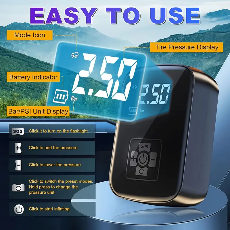Functions as an air compressor, power bank, flashlight, and tire pressure monitor