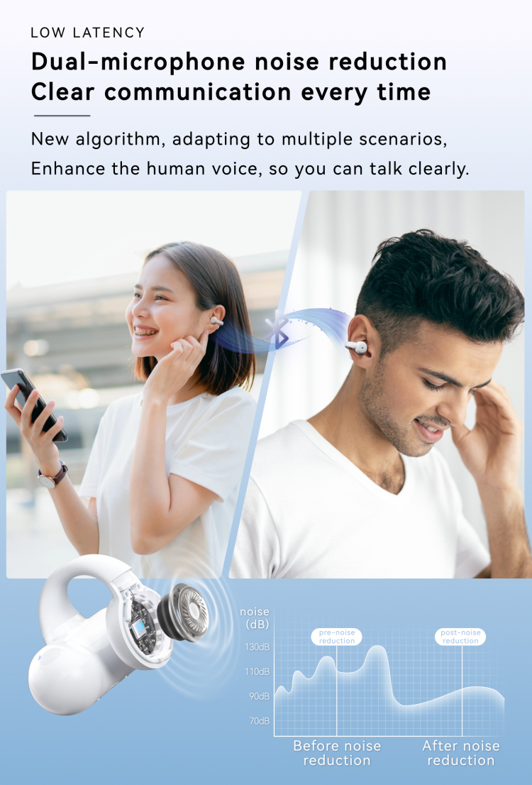 These earphones boast a stylish and ergonomic U-shaped clip that wraps comfortably around your ear without blocking your ear canal. Perfect for users who wear glasses, hats, or helmets—offering a pressure-free fit and letting you stay aware of your surroundings.