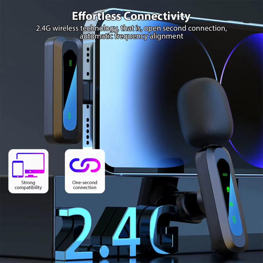 1. Effortless Connectivity: Experience seamless setup with our Wireless Clip on Microphones, featuring 2.4G wireless technology that allows for instant pairing and connection. With just a press of a button, this mini microphone is ready to use, freeing you from cumbersome wires and enabling hassle-free outdoor live streaming.